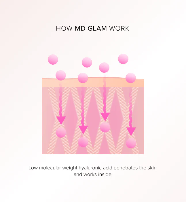 MD GLAM contains low molecular weight hyaluronic acid, a small particle size, that can actually penetrate the skin and be effective. This ingredient is extremely rare and took months for Dr. Cat to source.