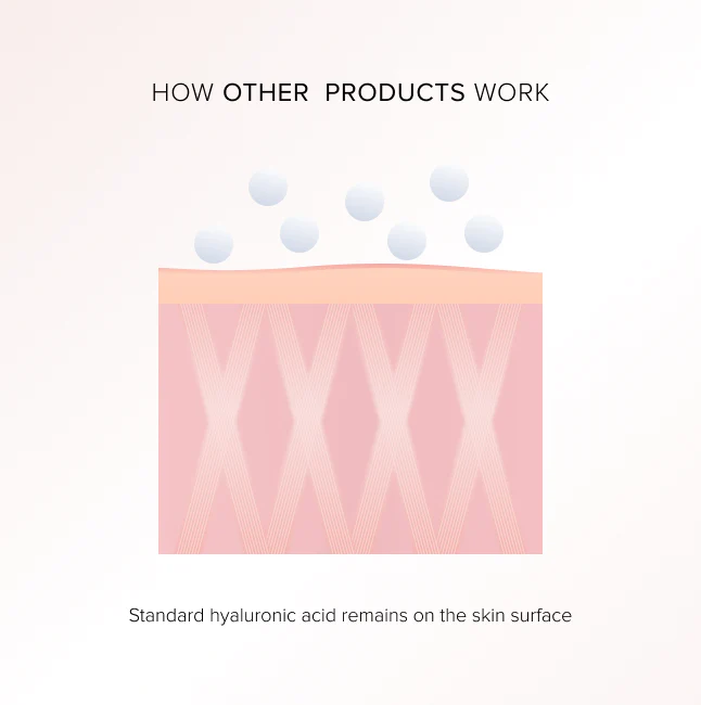 Dryness and loss of skin moisture contributes to aging. Hyaluronic acid improves skin elasticity and reduces the depth of wrinkles. However, the standard hyaluronic acid found in most products on the market is too large to actually penetrate the skin and just sits on top of it.